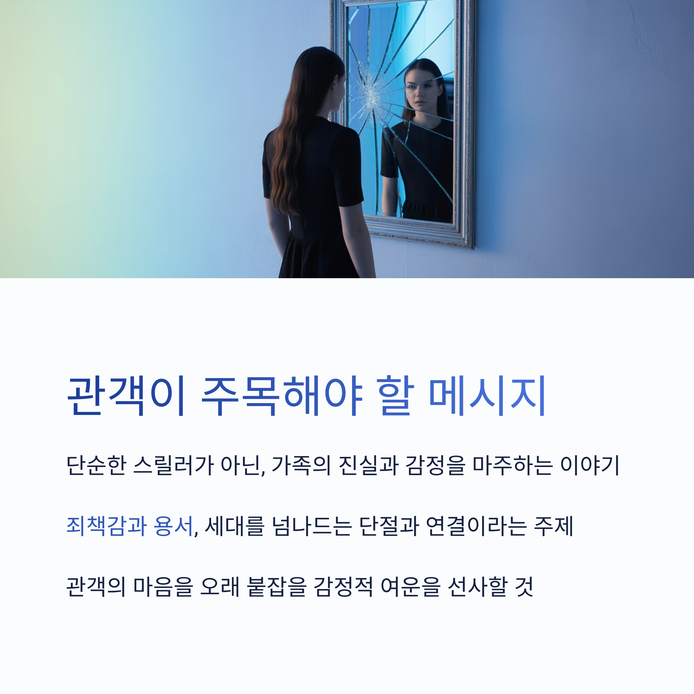 이 영화는 단순히 실종 사건을 다루는 스릴러가 아니라, 한 가족의 진실과 감정을 마주하는 이야기입니다. 죄책감과 용서, 그리고 세대를 넘나드는 단절과 연결이라는 주제가 관객 마음을 오래 붙잡을 것으로 보입니다.