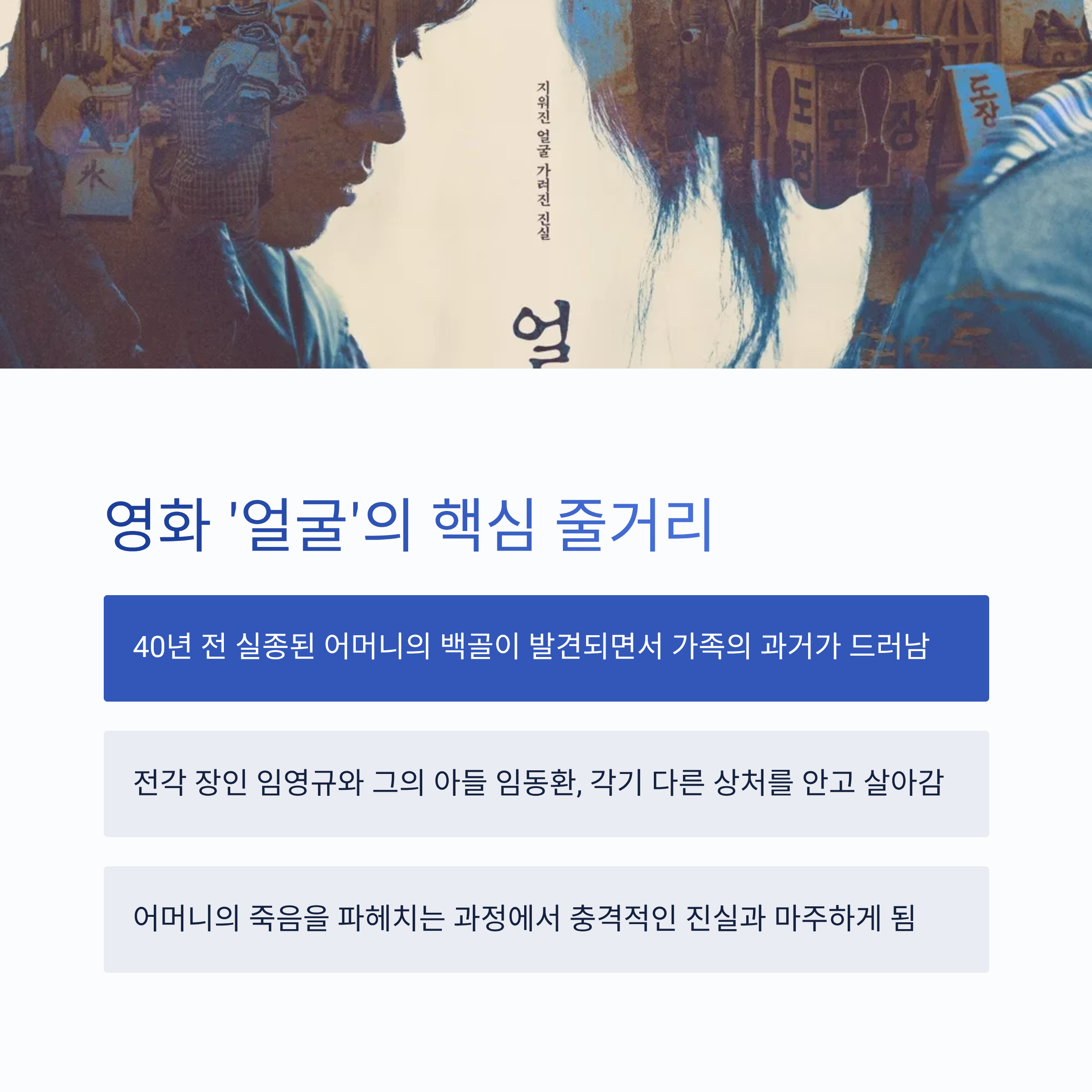 40년 전 실종된 어머니의 백골이 발견되면서 주인공 가족의 과거가 수면 위로 드러납니다. 전각 장인 임영규와 그의 아들 임동환은 각기 다른 상처를 안고 살아가지만, 어머니의 죽음을 파헤치는 과정에서 충격적인 진실과 마주하게 됩니다. 단순한 사건 추적이 아닌, 죄의식과 용서, 세대 간의 단절과 연결을 담아낸 감정 중심의 서사가 돋보입니다.