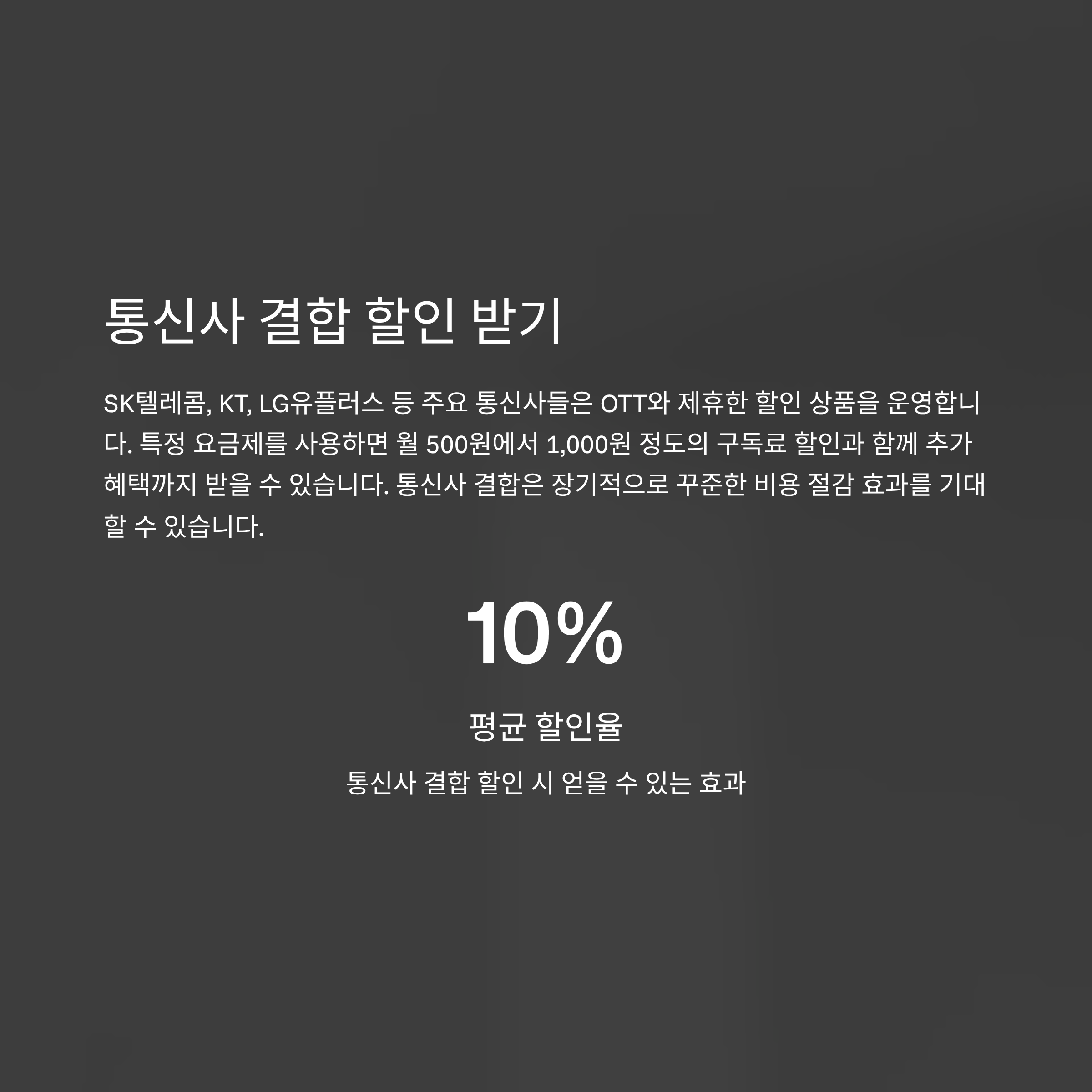 SK텔레콤, KT, LG유플러스 등 주요 통신사들은 OTT와 제휴한 할인 상품을 운영합니다. 특정 요금제를 사용하면 월 500원에서 1,000원 정도의 구독료 할인과 함께 추가 혜택까지 받을 수 있습니다. 통신사 결합은 장기적으로 꾸준한 비용 절감 효과를 기대할 수 있습니다.