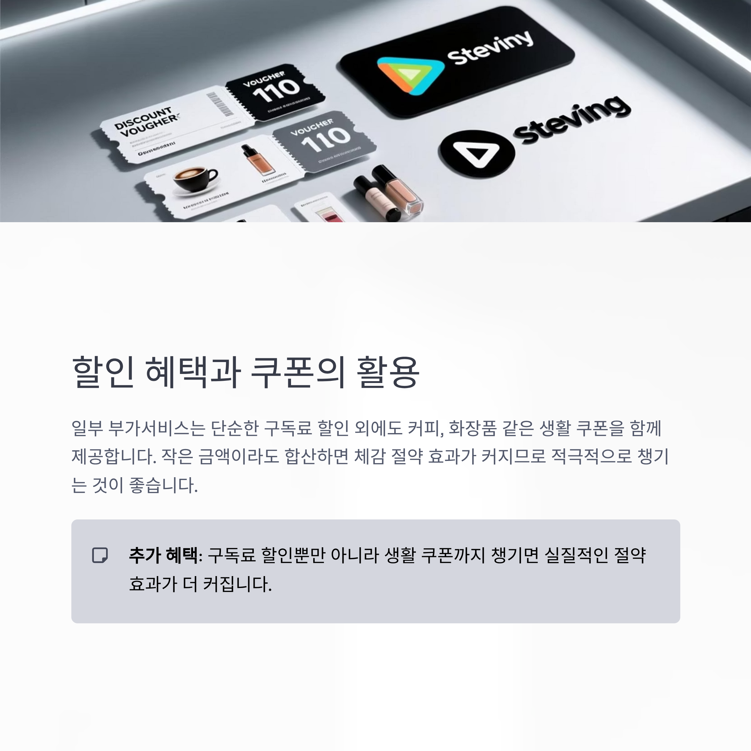 일부 부가서비스는 단순한 구독료 할인 외에도 커피, 화장품 같은 생활 쿠폰을 함께 제공합니다. 작은 금액이라도 합산하면 체감 절약 효과가 커지므로 적극적으로 챙기는 것이 좋습니다.