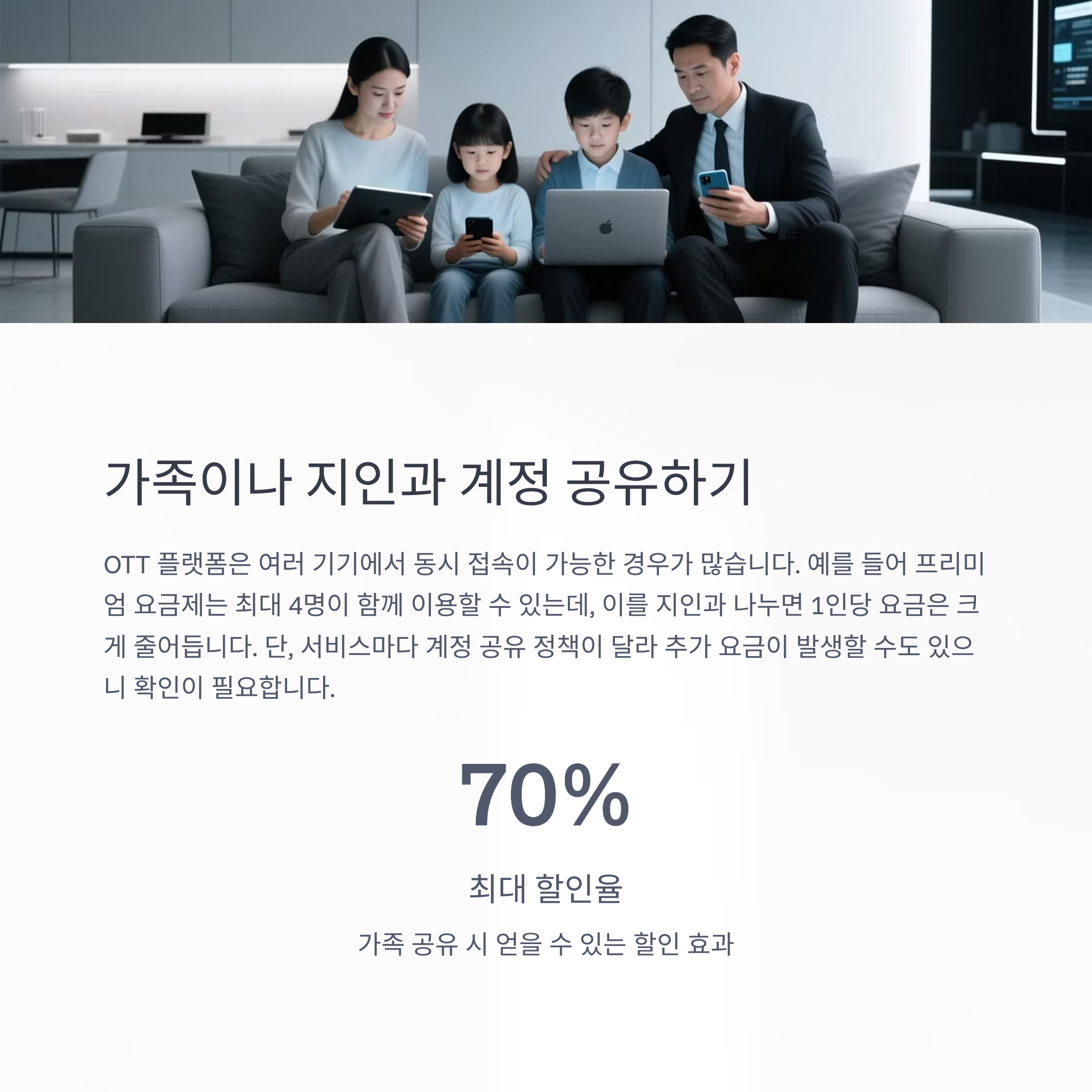OTT 플랫폼은 여러 기기에서 동시 접속이 가능한 경우가 많습니다. 예를 들어 프리미엄 요금제는 최대 4명이 함께 이용할 수 있는데, 이를 지인과 나누면 1인당 요금은 크게 줄어듭니다. 단, 서비스마다 계정 공유 정책이 달라 추가 요금이 발생할 수도 있으니 확인이 필요합니다.