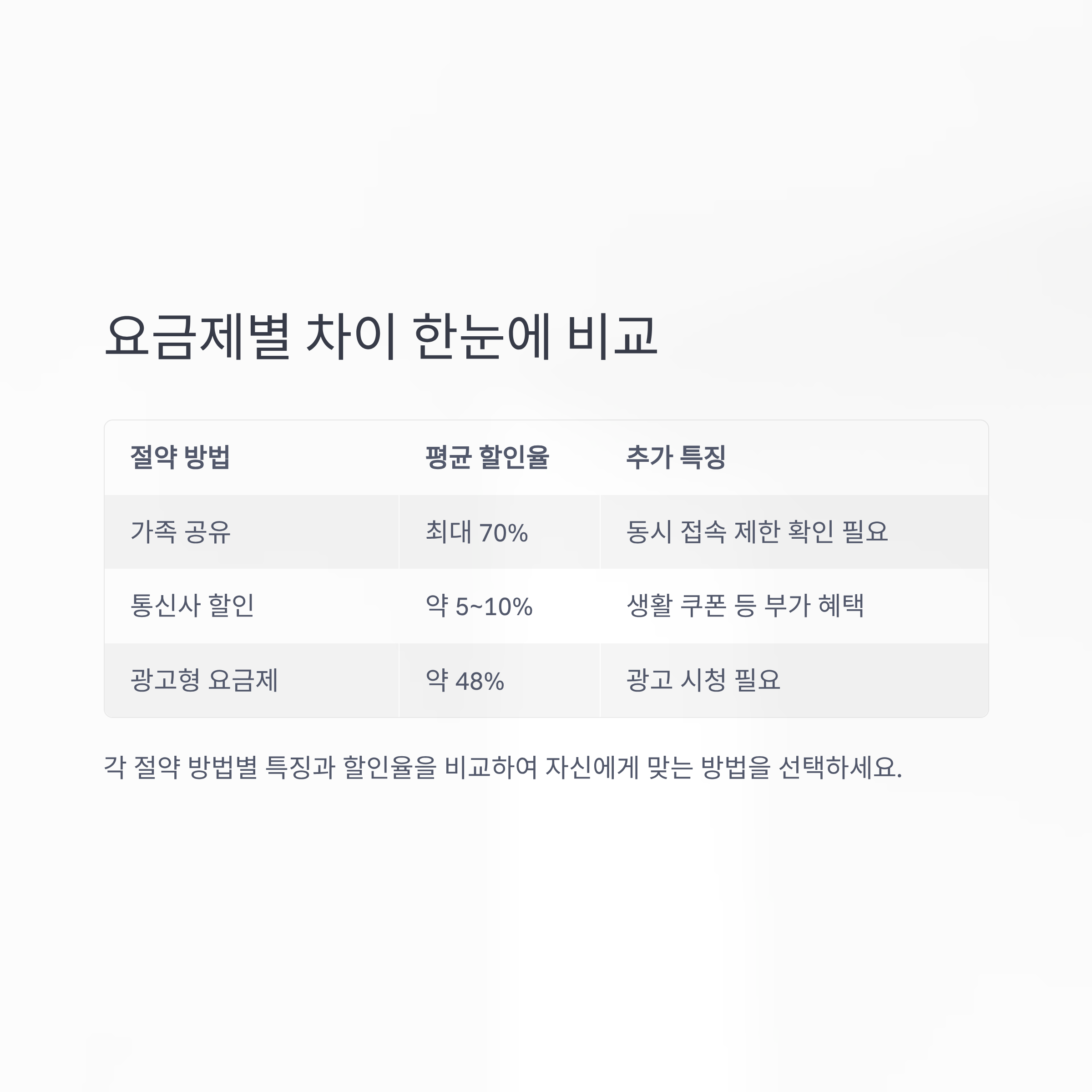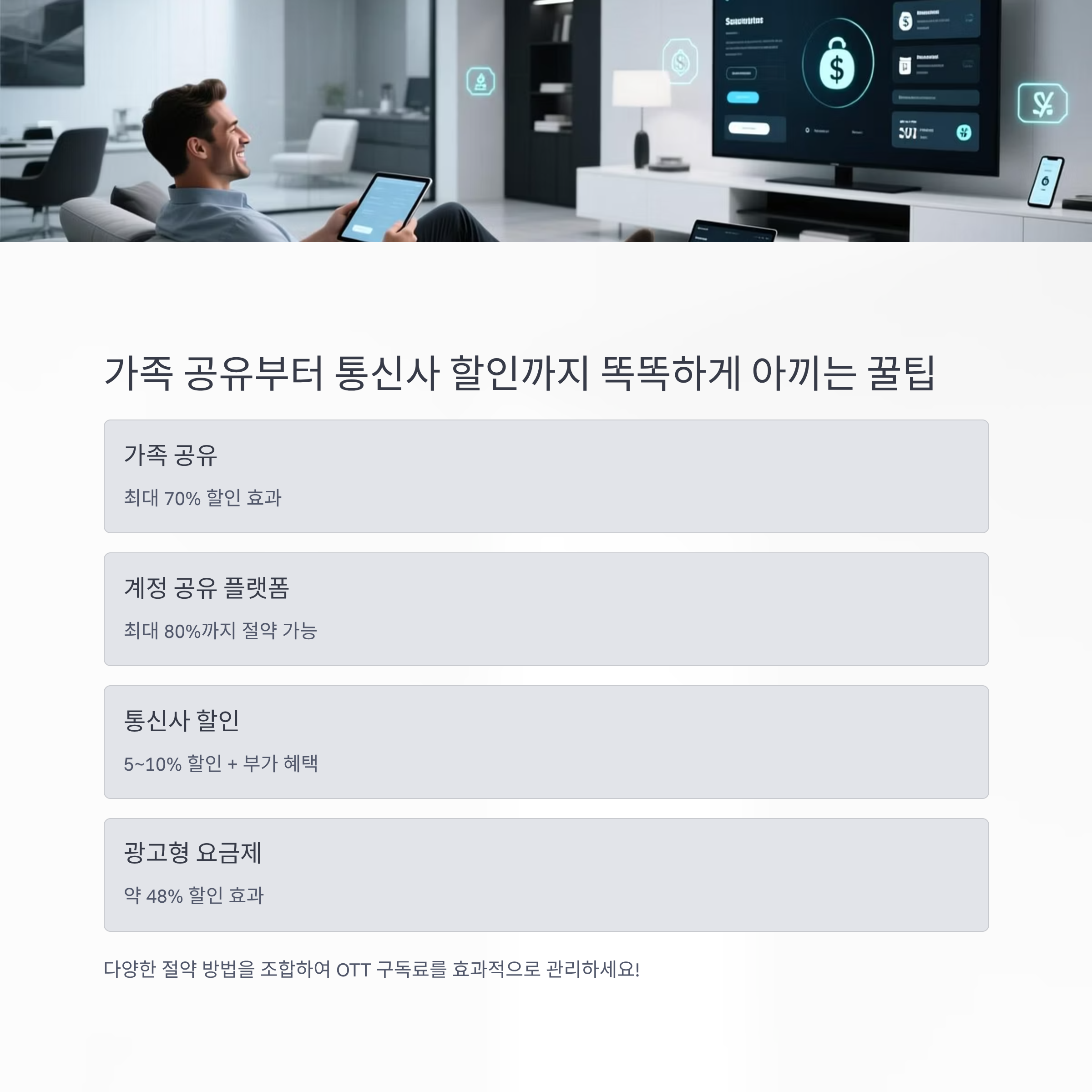 OTT 구독 서비스가 일상이 되면서 매달 빠져나가는 비용이 적지 않은 부담이 되고 있습니다. 하지만 몇 가지 방법을 활용하면 같은 서비스를 훨씬 저렴하게 즐길 수 있습니다. 가족 공유, 통신사 할인, 광고형 요금제까지 대표적인 절약 전략을 정리해 드리겠습니다.