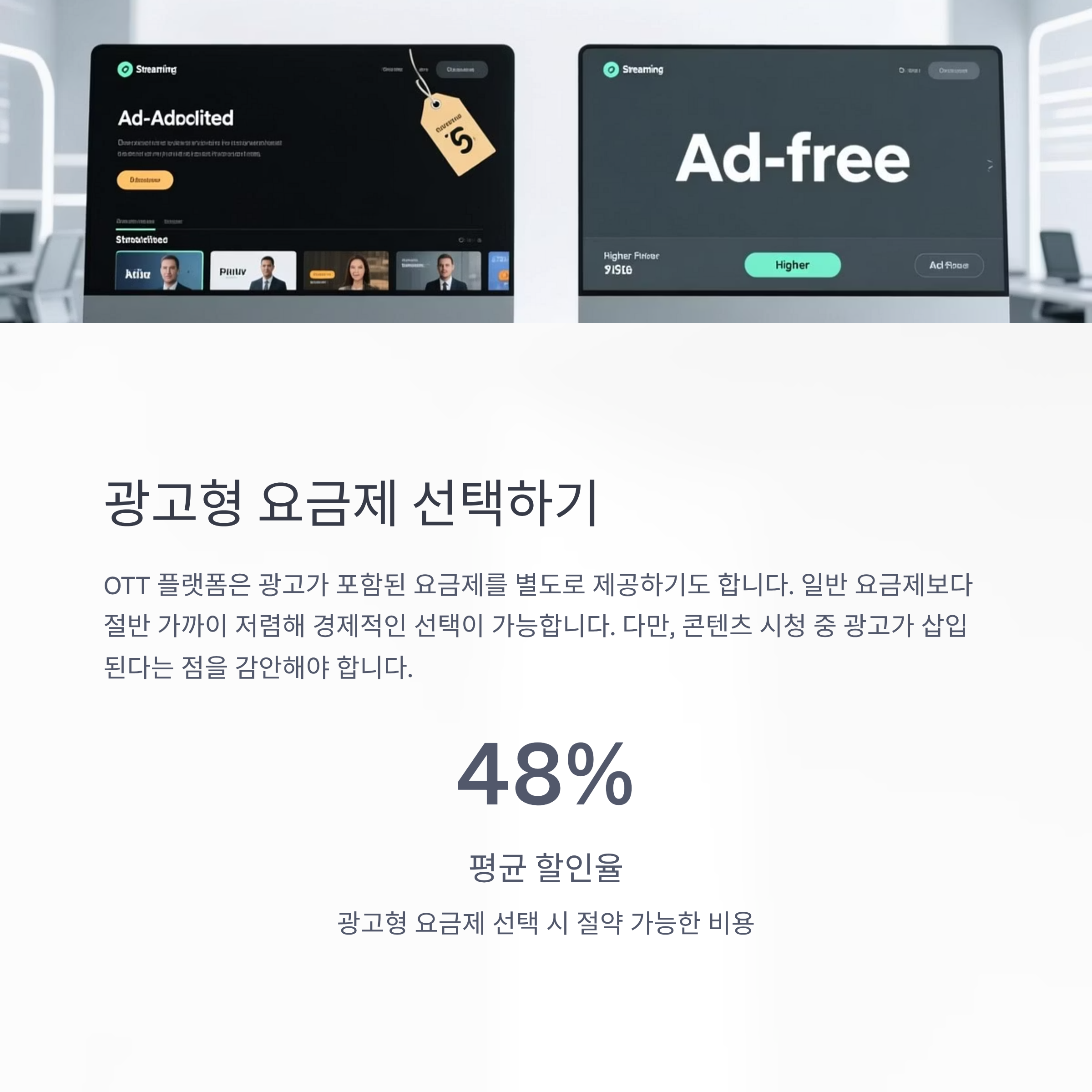 OTT 플랫폼은 광고가 포함된 요금제를 별도로 제공하기도 합니다. 일반 요금제보다 절반 가까이 저렴해 경제적인 선택이 가능합니다. 다만, 콘텐츠 시청 중 광고가 삽입된다는 점을 감안해야 합니다.