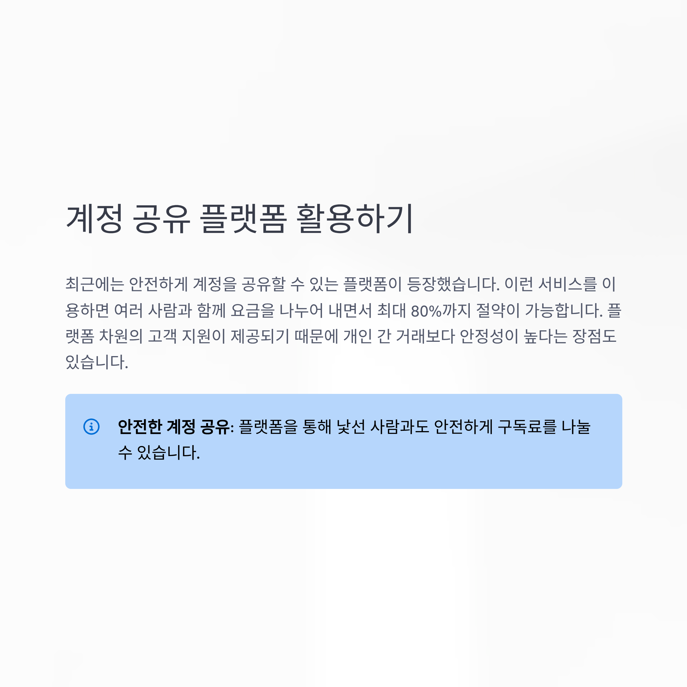 최근에는 안전하게 계정을 공유할 수 있는 플랫폼이 등장했습니다. 이런 서비스를 이용하면 여러 사람과 함께 요금을 나누어 내면서 최대 80%까지 절약이 가능합니다. 플랫폼 차원의 고객 지원이 제공되기 때문에 개인 간 거래보다 안정성이 높다는 장점도 있습니다.