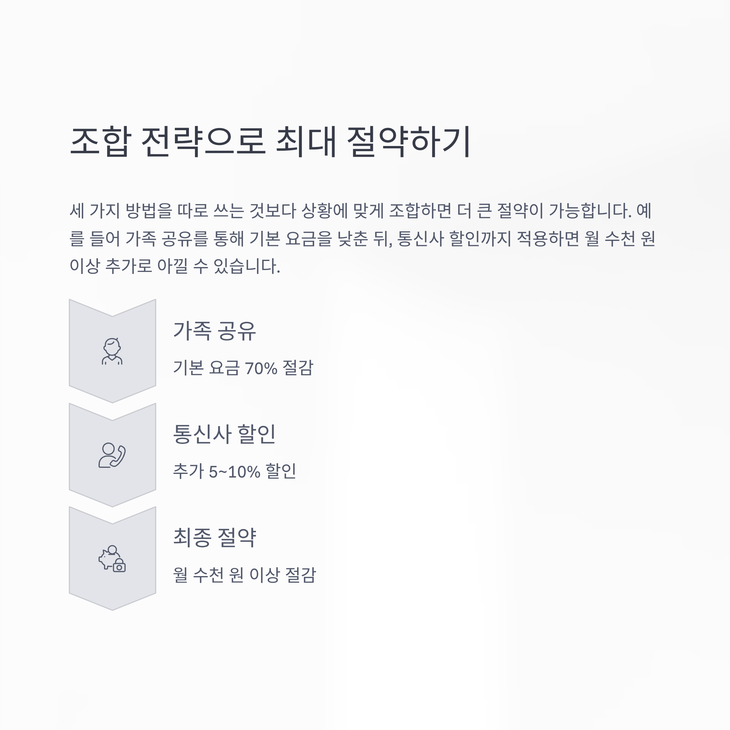 세 가지 방법을 따로 쓰는 것보다 상황에 맞게 조합하면 더 큰 절약이 가능합니다. 예를 들어 가족 공유를 통해 기본 요금을 낮춘 뒤, 통신사 할인까지 적용하면 월 수천 원 이상 추가로 아낄 수 있습니다.